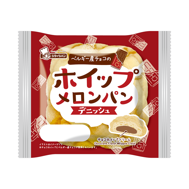 ベルギー産チョコレート入りのホイップがたっぷり入ったデニッシュメロンパンです。