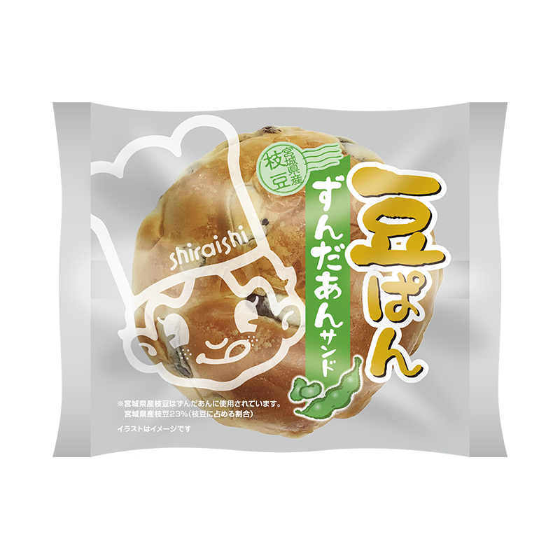 宮城県産枝豆入りのずんだあんを、優しい甘さの甘納豆が入った豆ぱんで挟みました。 ※宮城県産枝豆23%(枝豆に占める割合)