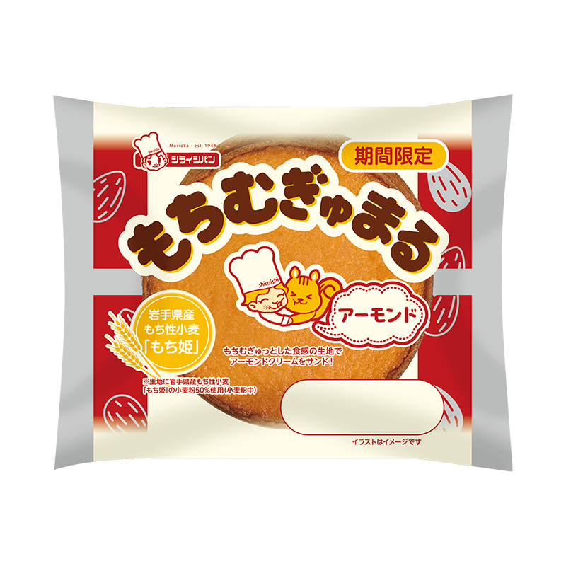 岩手県産もち性小麦「もち姫」の小麦粉を使用した もちむぎゅっとした食感の生地で、アーモンドクリームを挟みました。 ※岩手県産もち性小麦「もち姫」の小麦粉50%使用(小麦粉中)