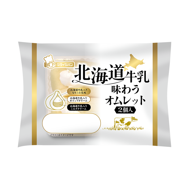 北海道牛乳使用のもちっとした生地に、北海道牛乳入りのホイップクリームとミルククリームを挟んだオムレットを2個入りにしました。