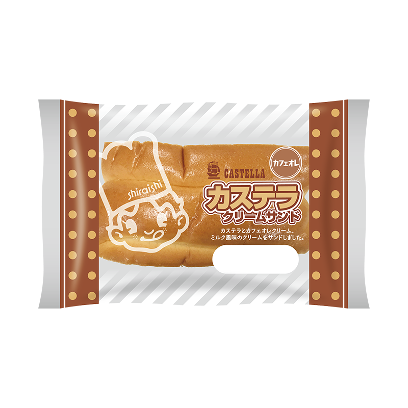 カステラ、カフェオレクリーム、ミルク風味のクリームをふんわりとしたパンで挟みました。