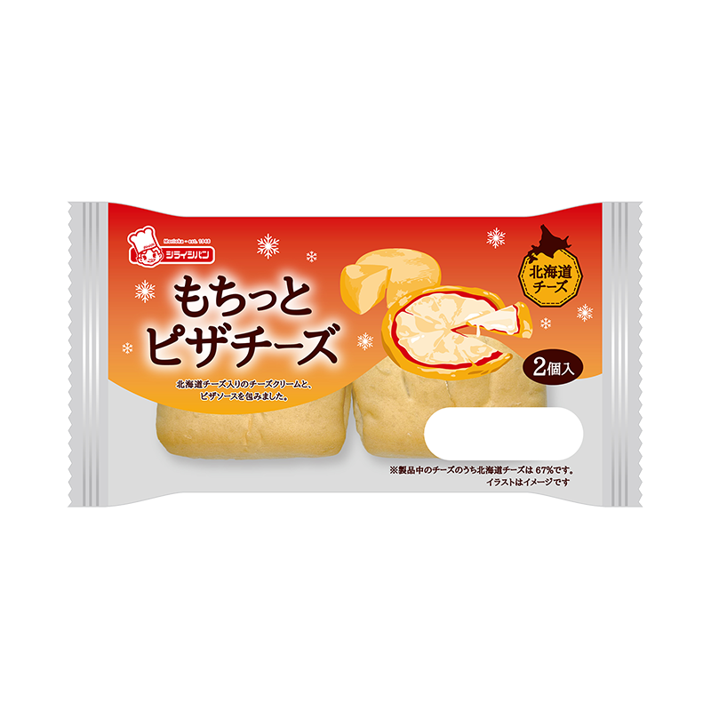 北海道チーズ入りのチーズクリームと、ピザソースを包んだもちっとした食感の惣菜パンを2個入りにしました。 ※製品中のチーズのうち北海道チーズは67%です。