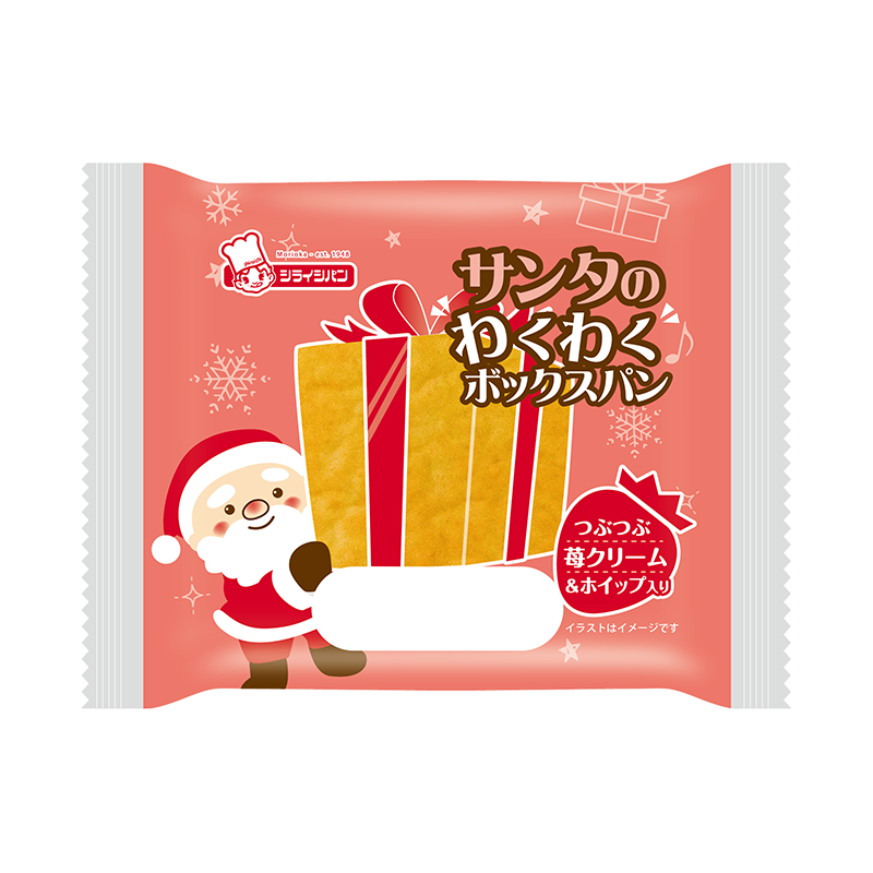 果肉感のあるいちごクリームと、ホイップクリームを包んだボックス型のパンを、クリスマスパッケージに入れました。