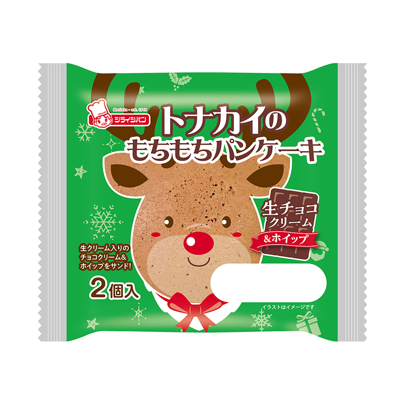 ホイップクリームと生クリーム入りのチョコクリームを挟んだもちもち食感のパンケーキを、トナカイの顔に見立てたクリスマスパッケージに入れました。2個入りです。