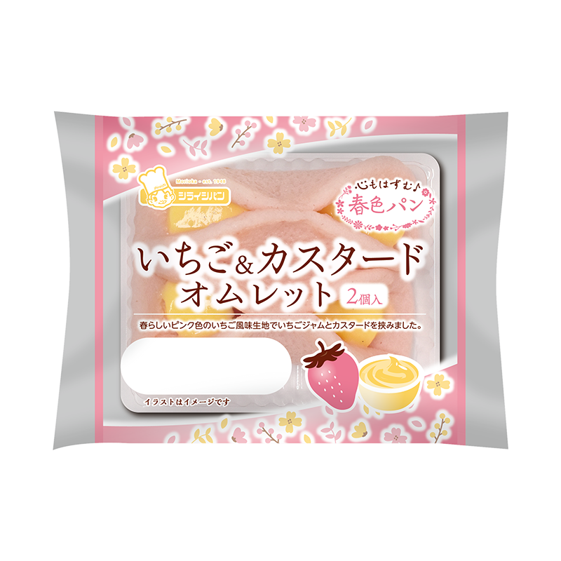 いちご風味の生地で、いちごジャムとカスタードクリームを挟んだオムレットを2個入りにしました。
